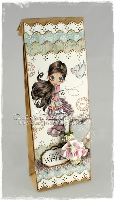 Jeg måtte selvsagt ha med meg et Magnolia stempel. Her har jeg brukt en av de mange mini'ene mine, denne heter Tilda with many hearts. Alle kantene er svertet med Distress ink- walnut stain. Stempelet er fargelagt med copics.